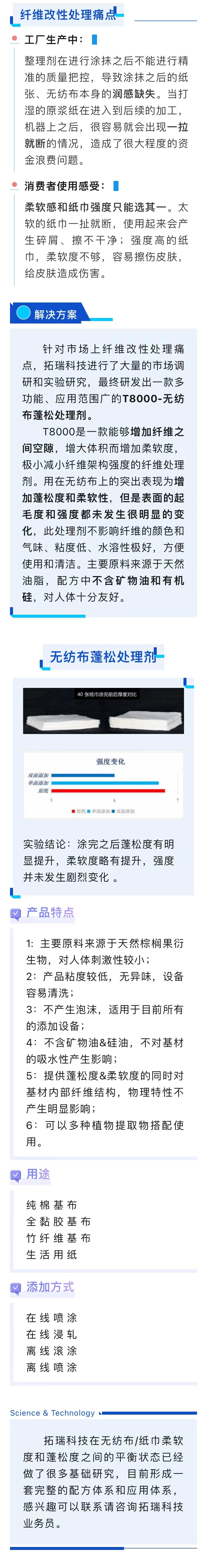 用在無紡布上的突出表現(xiàn)為增加蓬松度和柔軟性,但是表面的起毛度和強(qiáng)度都未發(fā)生很明顯的變化